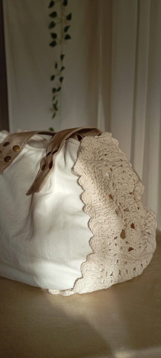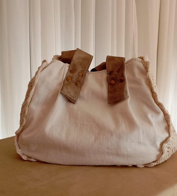 Bolso/cartera, realizado en género de algodón, intervenido con tejido de crochet, tiras ecocuero, con forro y bolsillo interno. Cierre reforzado.